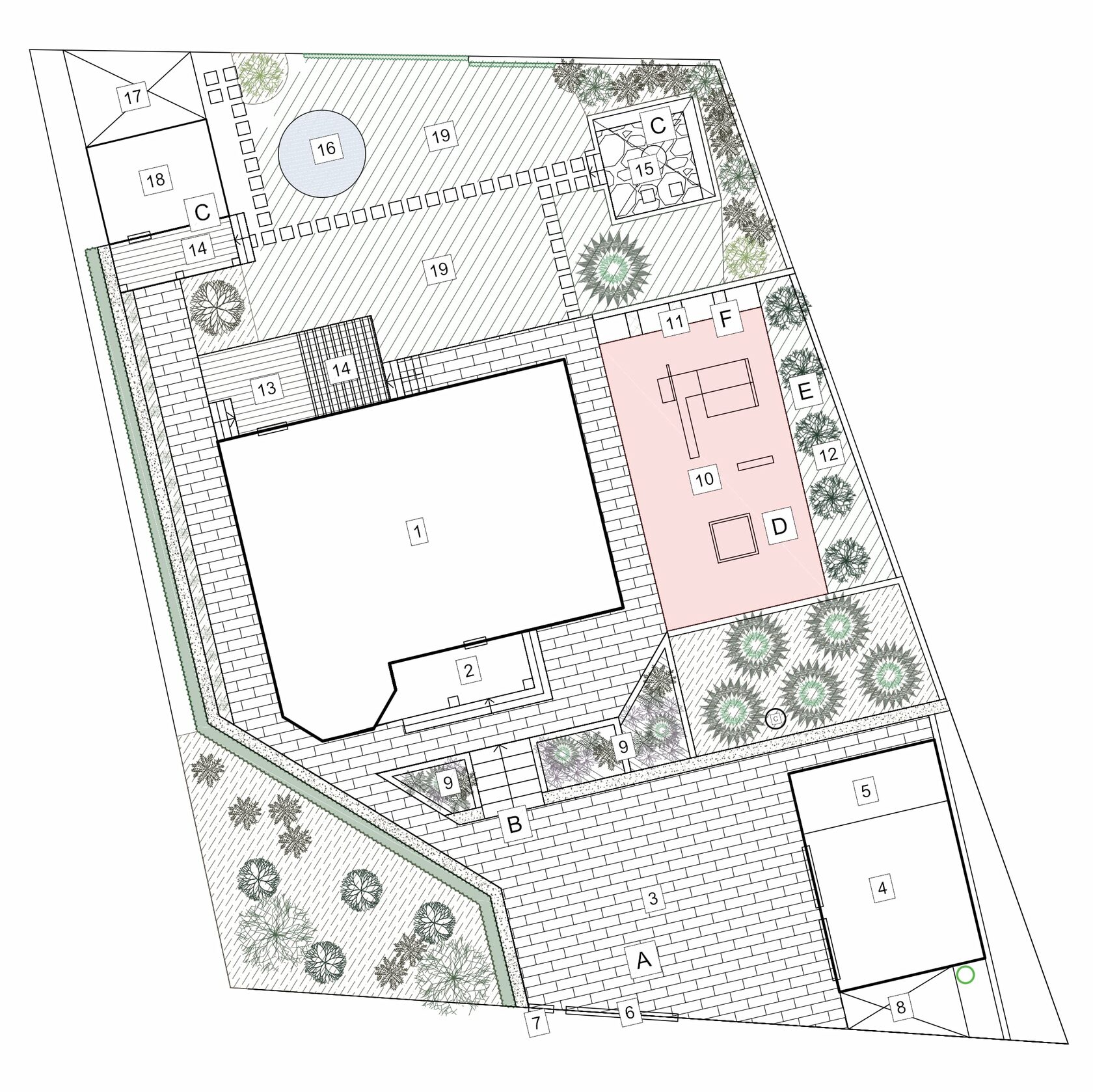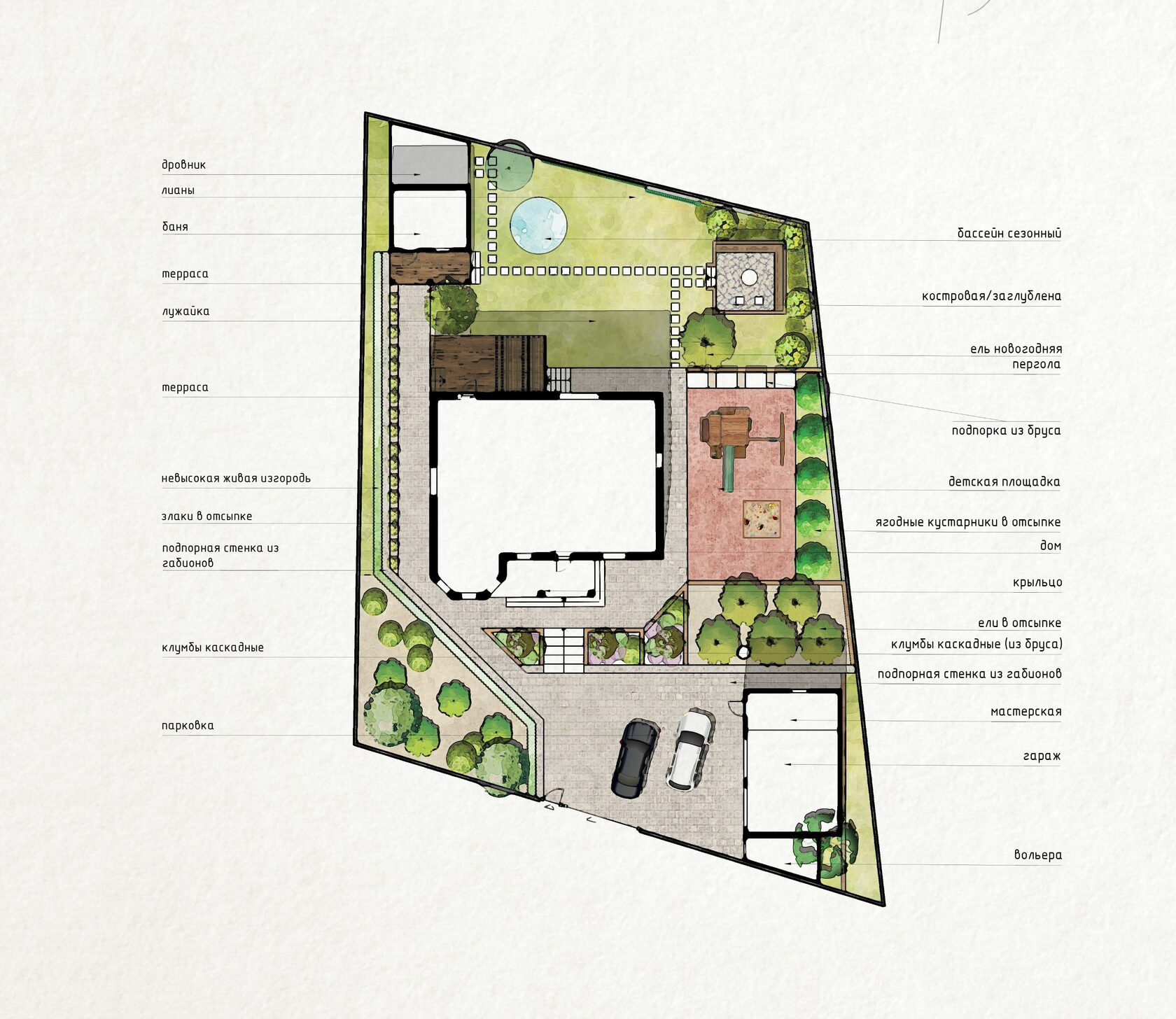 На таком участке особенно важно проследить сценарии движения. Потому что на главной дорожке необходима широкая удобная лестница, а для переноса дров в баню – пандус.