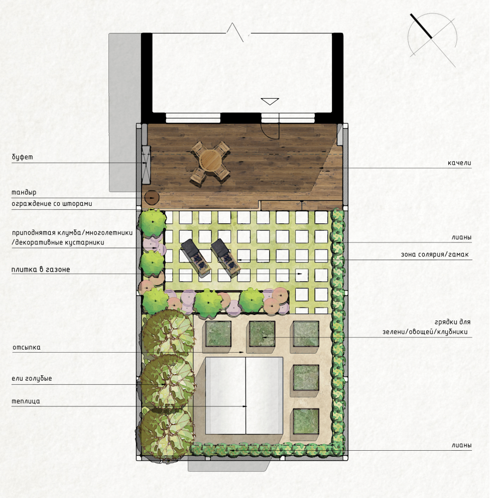 Чего не стоит делать в таком дворике: сажать большие деревья, строить печной комплекс или полноценную беседку.